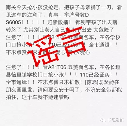近日,多则关于“开车抢小孩、偷小孩、让家长警惕”的信息在长垣微信朋友圈、各种社交群里流传着,让很多家长朋友内心充满不安。在此,长垣警方郑重声明:截至目前,我局并未接到此类报警,网上传播的信息均为虚假消息,广大群众要有一定的辨别能力,做到不信谣、不传谣。
